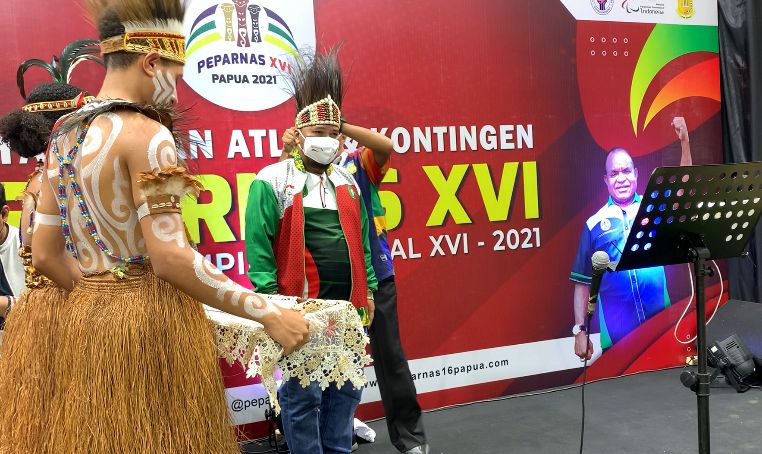 Upacara seremonial penyambutan kontingen tersebut, dipimpin Bapak Kasim, selaku Sekretaris IV PB PEPARNAS INDONESIA ke-XVI, dengan pemakaian Mahkota bulu burung Kasuari sebagai lambang penghormatan setinggi-tingginya kepada alam yang memberikan kehidupan.